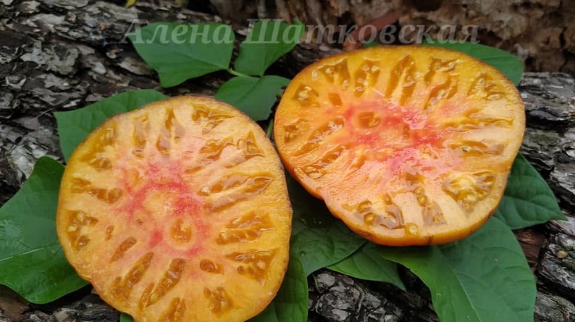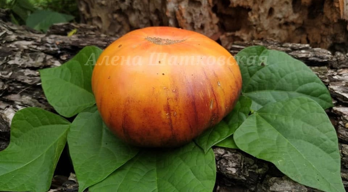 Індетермінантний, середньопізній, кущ 1,6м. Плоди плоскоокруглі, дуже красиві, вагою 200-400 грам, помаранчеві з фіолетовою плямою у плодоніжки. У розрізі м’якуш помаранчевий з червоним в центрі плода. М’ясисті, соковиті, солодкого смаку із фруктовою кислинкою. Для свіжого споживання, нарізки, красивих салатів.