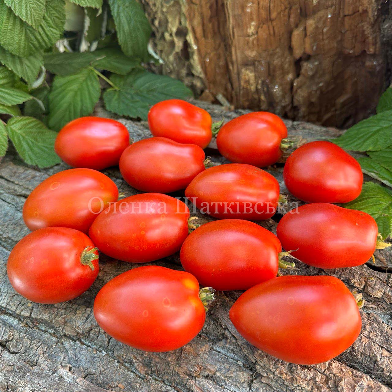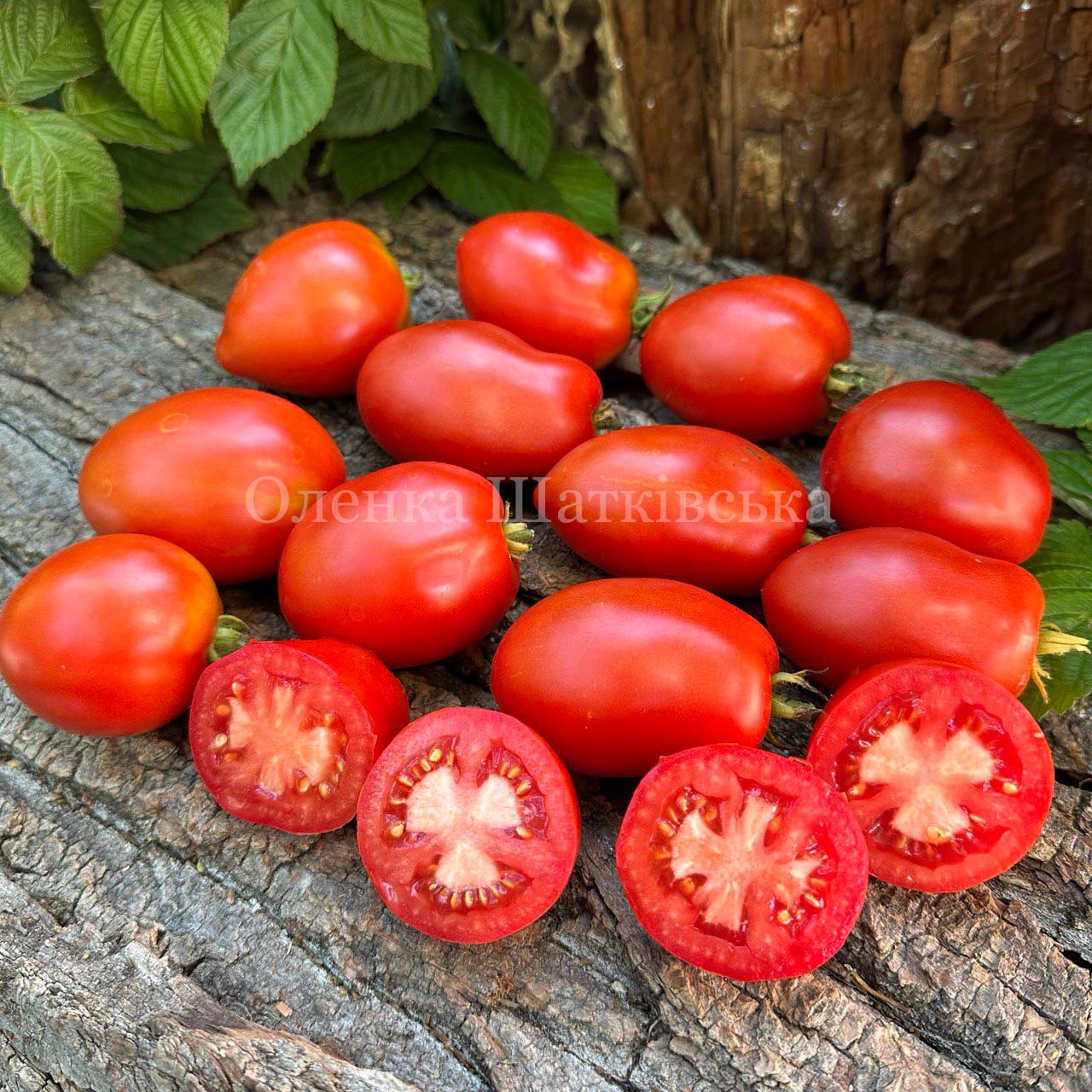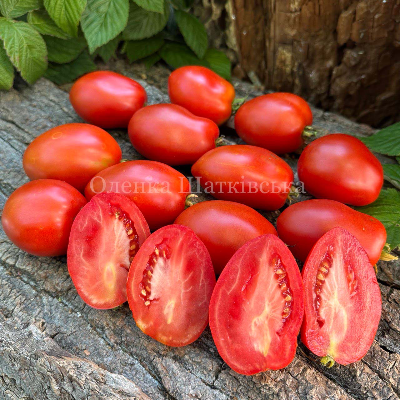 Середньостиглий, дуже врожайний сорт. Рослина висотою 70 – 100 см з широким, зморшкуватим листям. Плоди сливовидної форми з трохи вираженою серцеподібністю, яскраво-червоного кольору, помірно щільні, масою 120-180 г. М’якуш м’ясистий, солодкий і ароматний, чудового смаку. Сорт універсального призначення.
