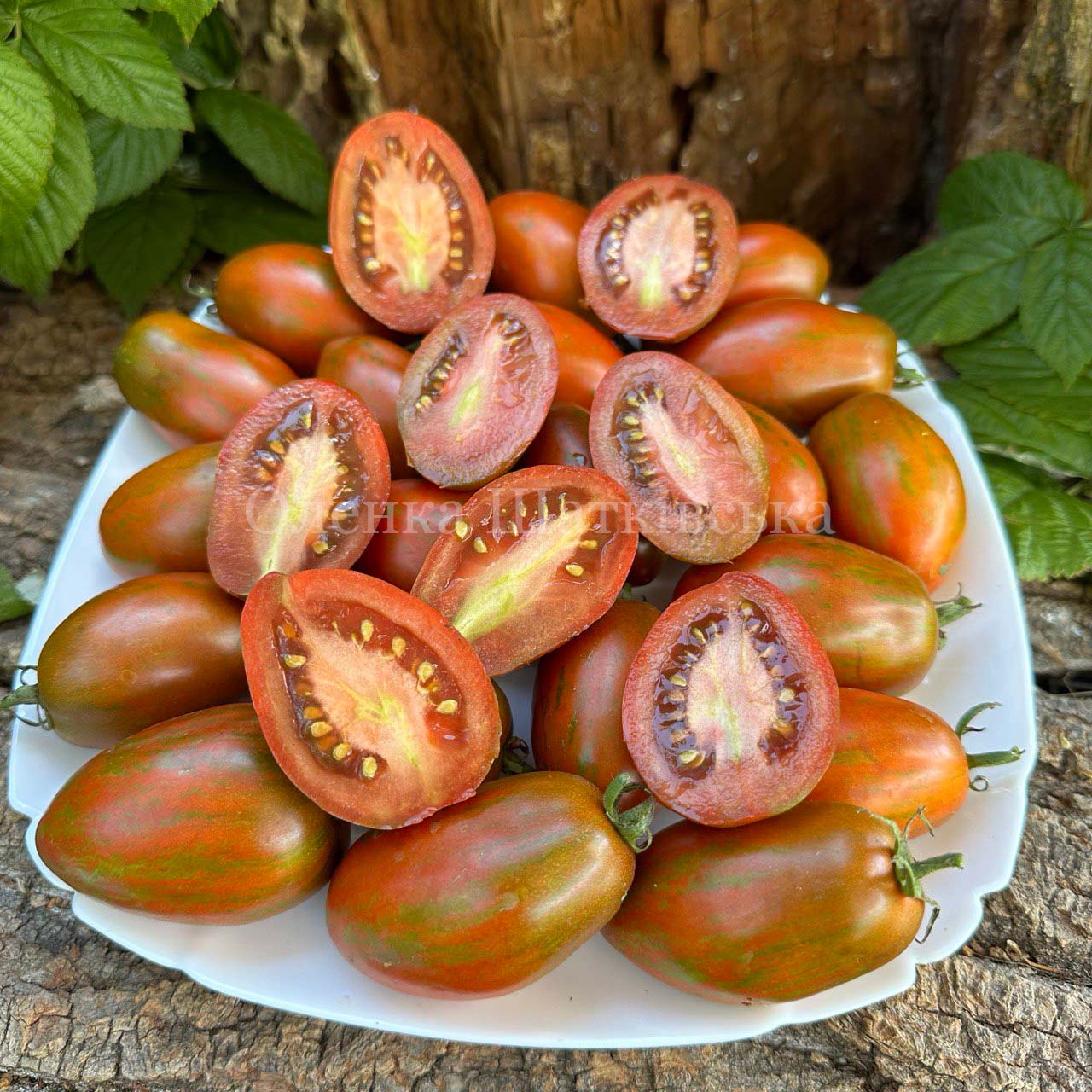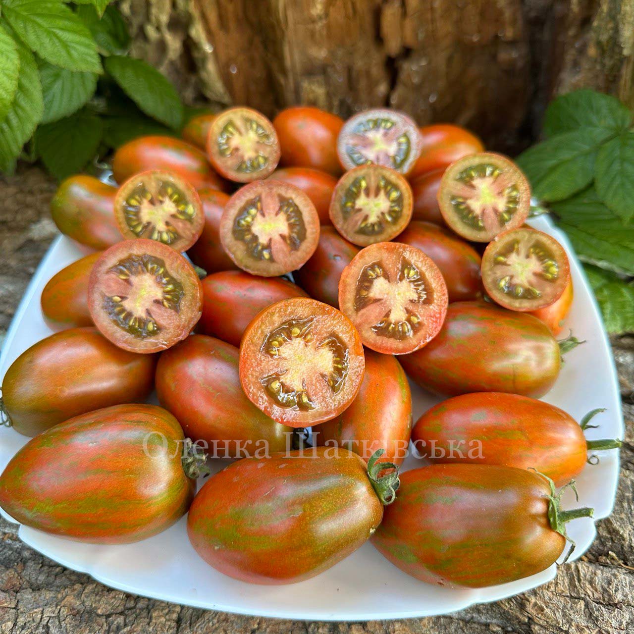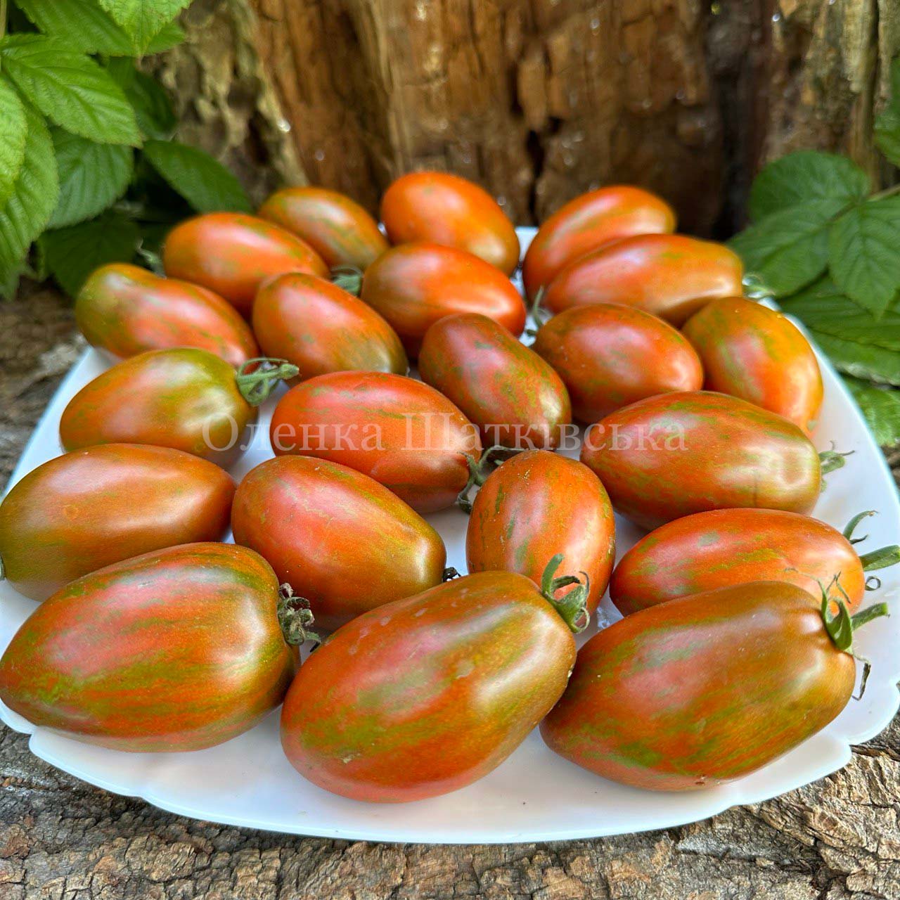 Детермінант, середньостиглий, кущ 60 см, з зморшкуватим листям, дуже врожайний. Плоди у формі витягнутої сливки, вагою 50-100 г, цегляного кольору, з оливковими смужками. Щільні, соковиті, смак збалансований приємний. Призначення універсальне.