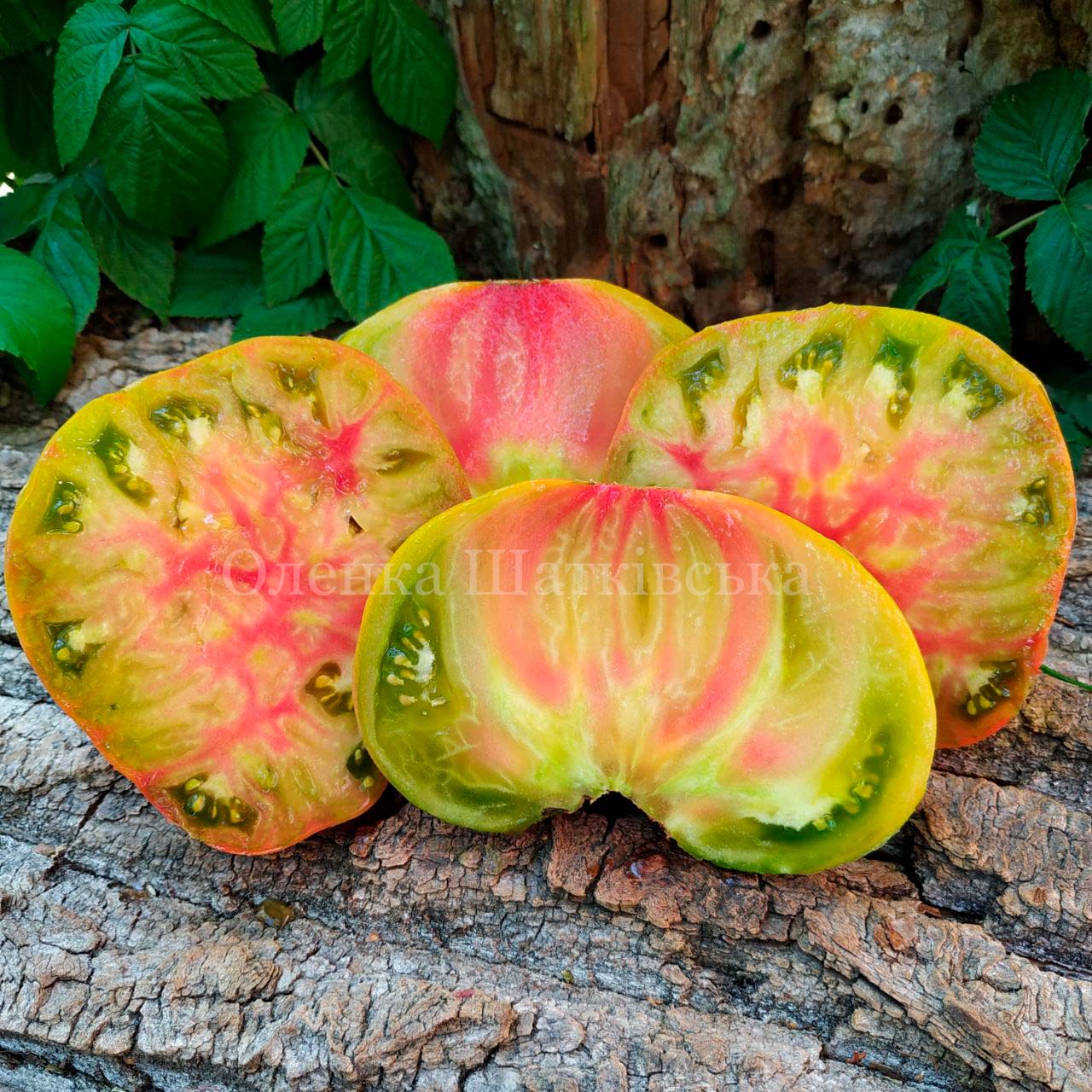 Середньоранній, високоврожайний сорт, кущ заввишки 1,9 м. Плоди плоскоокруглі, зелені з рожево-бордовими плямами, вагою до 1 кг, соковиті, солодкі, з медовим смаком. Для свіжого споживання, салатів.