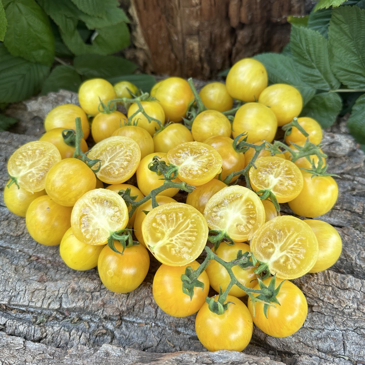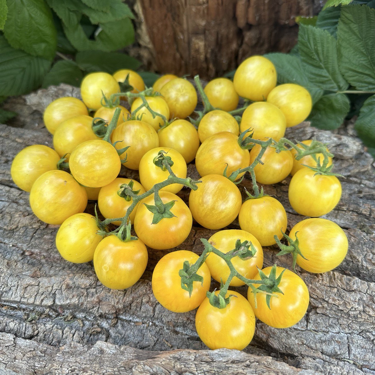 Томат Вернісаж жовтий – сорт середньораннього терміну дозрівання. Рекомендований для вирощування в теплицях і відкритому ґрунті. Сорт селекції Духова Р.М. (Україна). Кущ індетермінантного типу, лапатий, росте у висоту до 2-х метрів. Потрібна підв’язка до опори і пасинкування. Найкращий результат виходить при формуванні рослини в 2-3 стебла. Плоди округлої форми, рівні, в стадії зрілості пофарбовані в світло-жовтий колір з неповторним візерунком з темно-жовтих штрихів і смужок, маленькі, проте значно більші ніж черрі, окремий помідорчик досягає у вазі до 60 грамів, ростуть кистями по 8 штук. Шкірочка дуже щільна, погано знімається, помідори зовсім не схильні до розтріскування. М’якоть ніжна, дуже соковита, на смак солодка з ледь помітною кислинкою, аромат має томатний з приємними нотками.