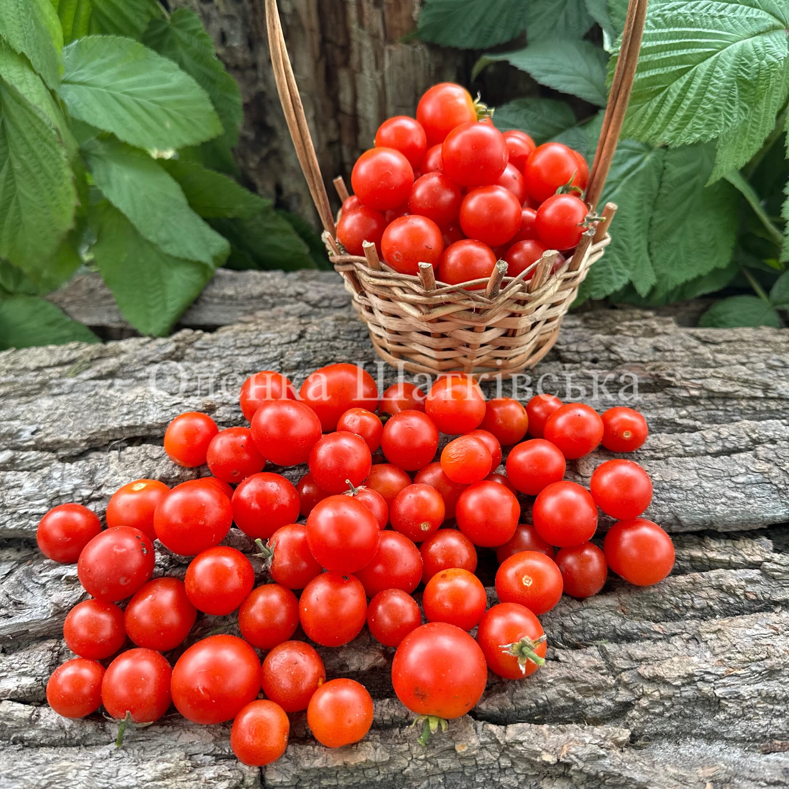 Детермінантний, ранньостиглий сорт карликового томату (чері), який ідеально підходить для вирощування у відкритому ґрунті, горщиках на балконі та під плівкою. Рослина компактна, досягає висоти 25-40 см, не потребує пасинкування та підв’язки. Плоди округлі, червоні, солодкі, масою 15-30 грам, ідеальні для свіжого споживання або консервування цілими.