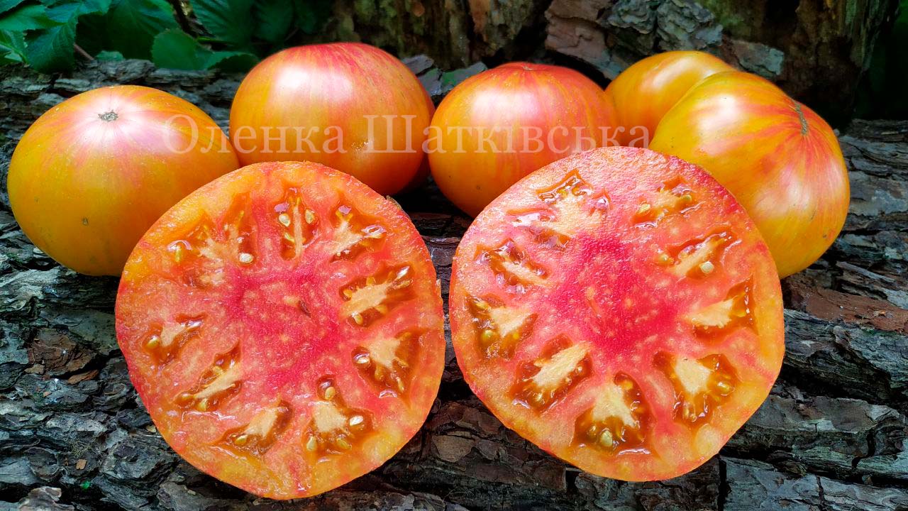 яскраво-жовті з рожевими смужками, дуже гарні на розрізі, смачні, солодкі із фруктовим присмаком. Для свіжого вжитку. Дуже гарний !!!