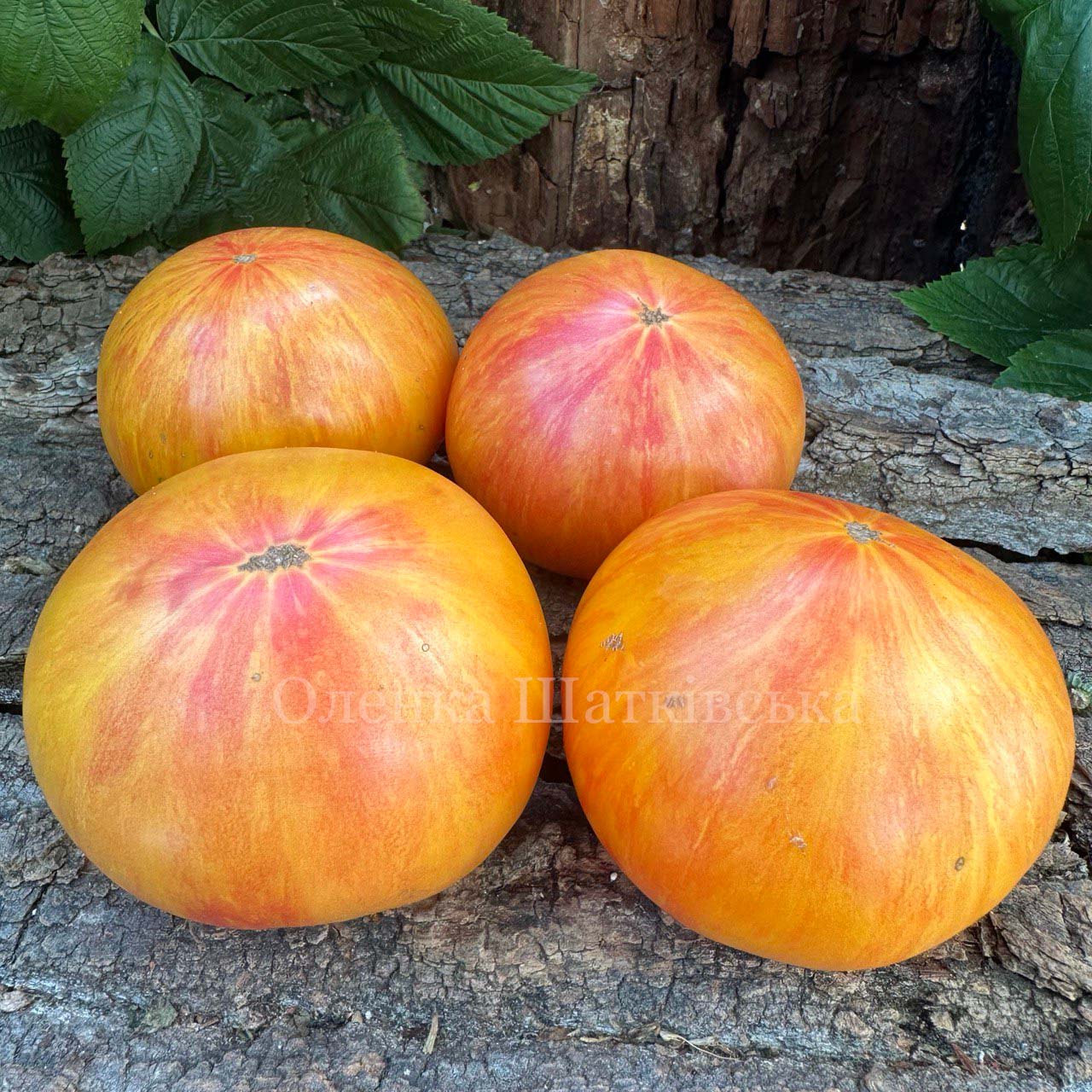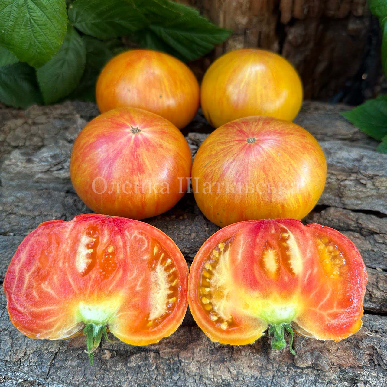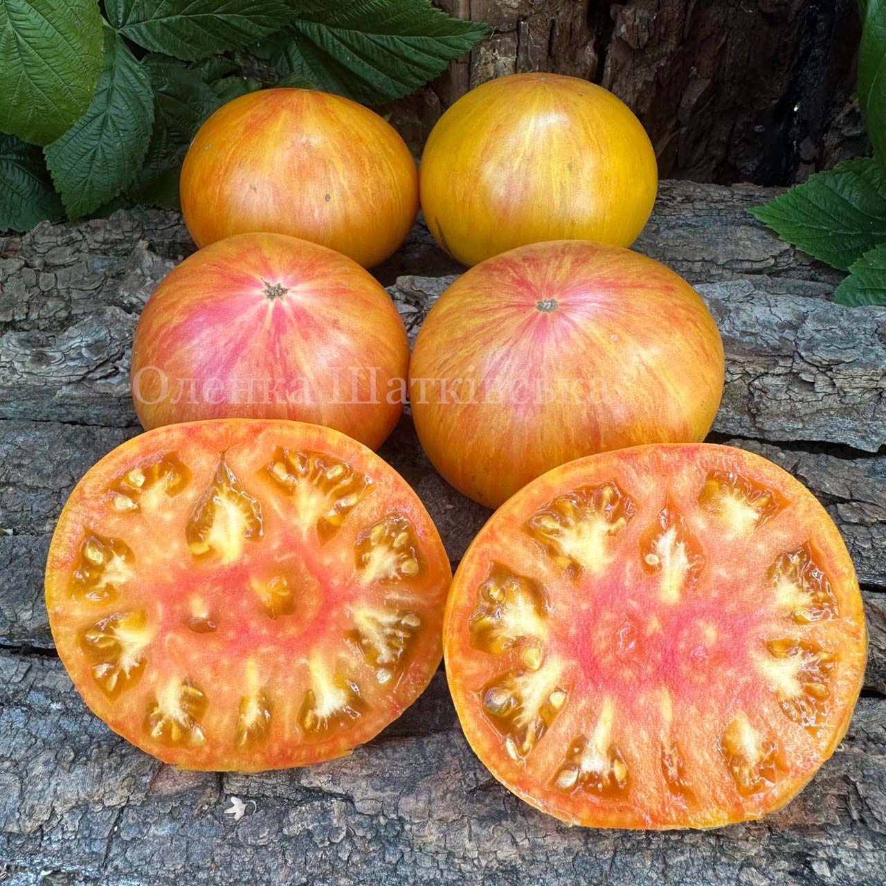 Індетермінантний, середньостиглий, кущ до 2 м. Плоди плоскоокруглої форми, у стадії зрілості дуже красиві біколори – на них поєднання золотисто-жовтих і червоних смужок і штрихів, вагою 200-300 грамів, м’ясисті, соковиті, ароматні та дуже смачні. М’якуш двокольоровий — золотий з прожилками червоного. Для свіжого споживання, приготування соків, соусів.