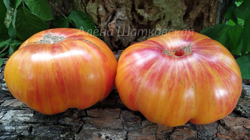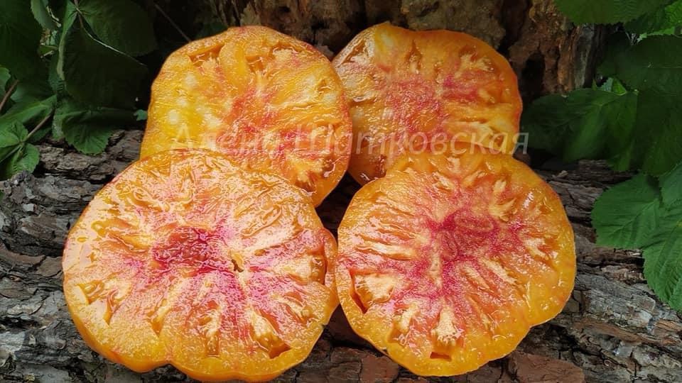 Плоди оригінальні, плоскоокруглі з ребристістю, великі до 300 грам, бі-колори, жовто-оранжево-червоні зі світлою штрихуванням. Солодкі із приємним фруктовим ароматом, відмінного смаку. Для свіжого споживання, гарного нарізування, соків.
