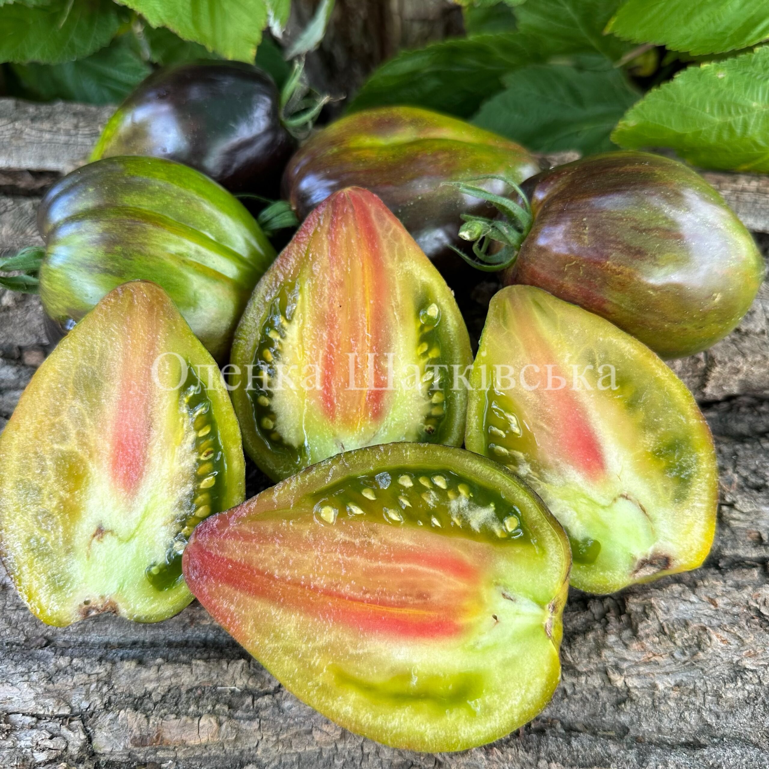 Індетермінантний, середньостиглий, кущ до 2 м. Плоди подовжено-серцеподібні з носиком, триколори-смарагдового кольору з рожевими та золотистими штрихами з антоціановими плічками, з дуже солодкою мармеладною м’якоттю, малонасіннєві, вагою 150-400г. Відмінний високоврожайний сорт, що плодоносить до пізньої осені. Для свіжого споживання, нарізки, салатів.