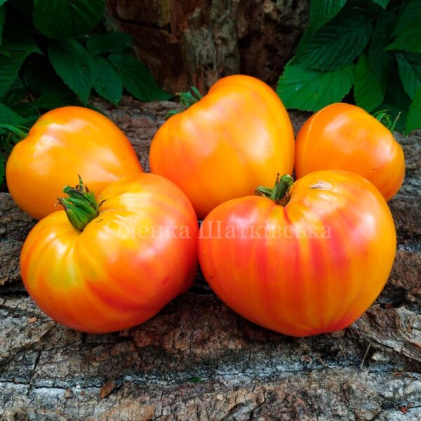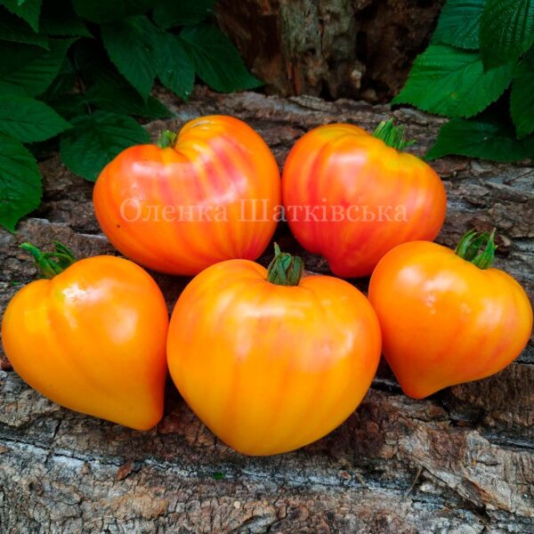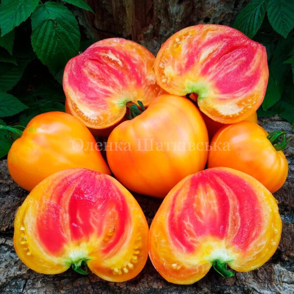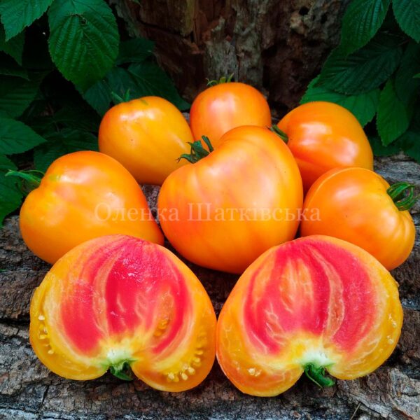 Плоди серцевидної форми, біколор, жовті з рожевим рум’янцем, вагою 200-500 грам. Щільні, м’ясисті, дуже смачні, солодкі з фруктовим присмаком. Високоврожайний. Для свіжого споживання, красивої нарізки.